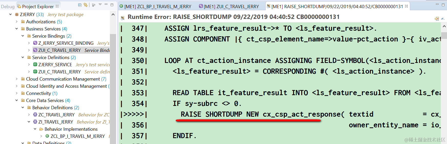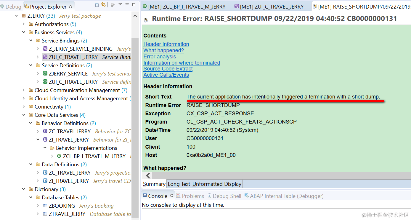回到ABAP Development Tool里,我们先点击Show超链接,就可以看到运行时错误明细:Short Text告诉我们,我们点击Accept按钮后,相关的处理框架有意地抛出一个CX_CSP_ACT_RESPONSE的异常。抛出异常的位置是在程序CL_CSP_ACT_CHECK_FEATS_ACTIONS里,这暗示我们,这个错可能和Action执行前的检查(CHECK)有关。