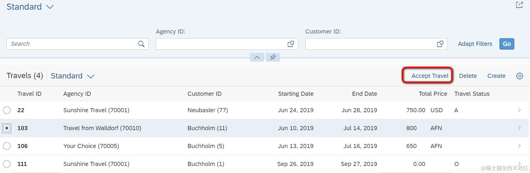 我选中ID为103这条记录,点击Accept Travel按钮后,期望通过该Action将其状态设置为Accepted: