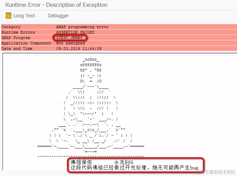 顺便提一句,如果您想自定义在SAP GUI里出现的ABAP运行时错误显示(就是在On-Premises环境下ST22事务码里看到的内容),比如添加一段"佛祖保佑,永无BUG",那么可以参考Jerry这篇文章: