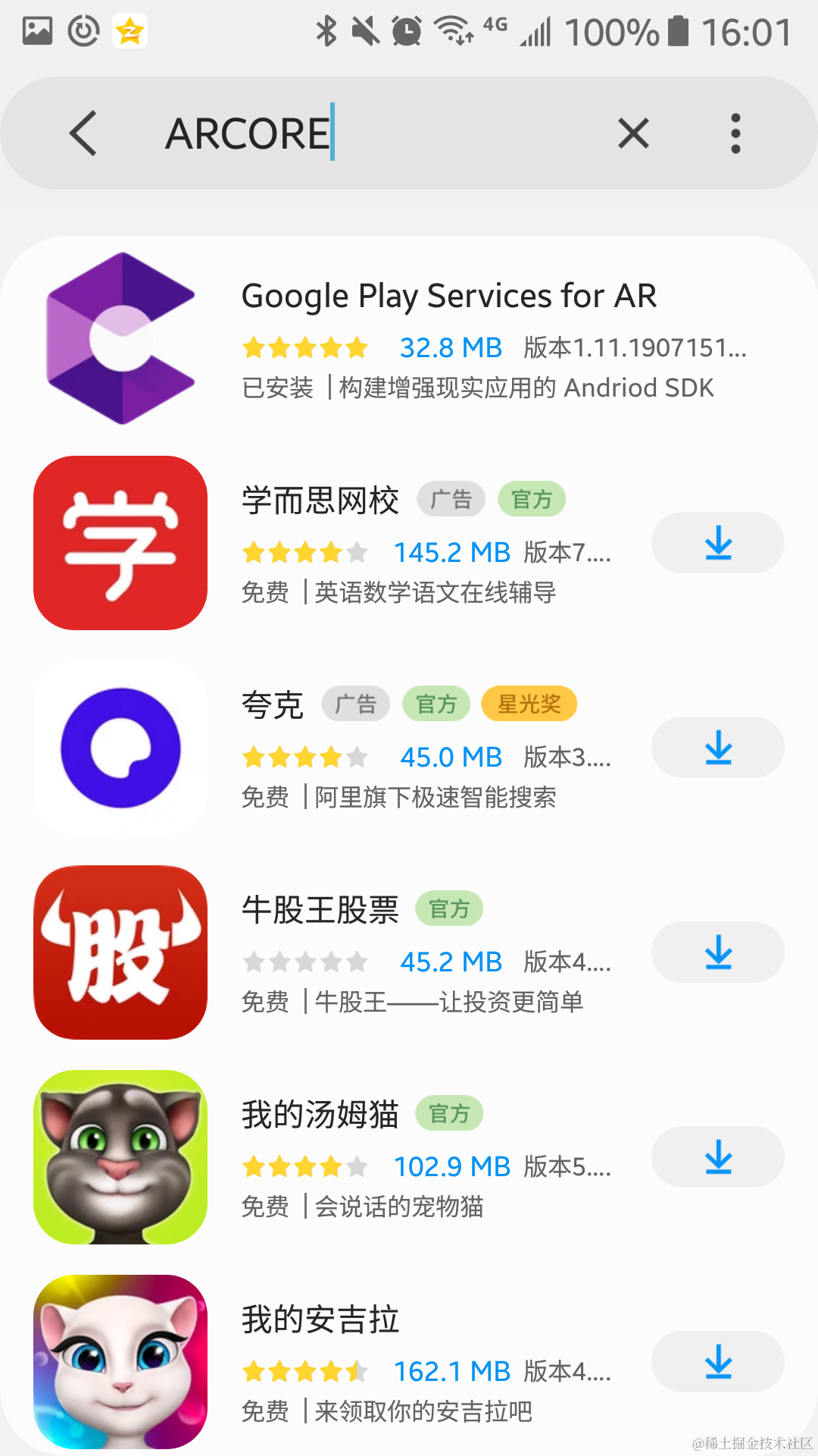 在三星应用商店或者腾讯应用包里搜索ARCore并下载: