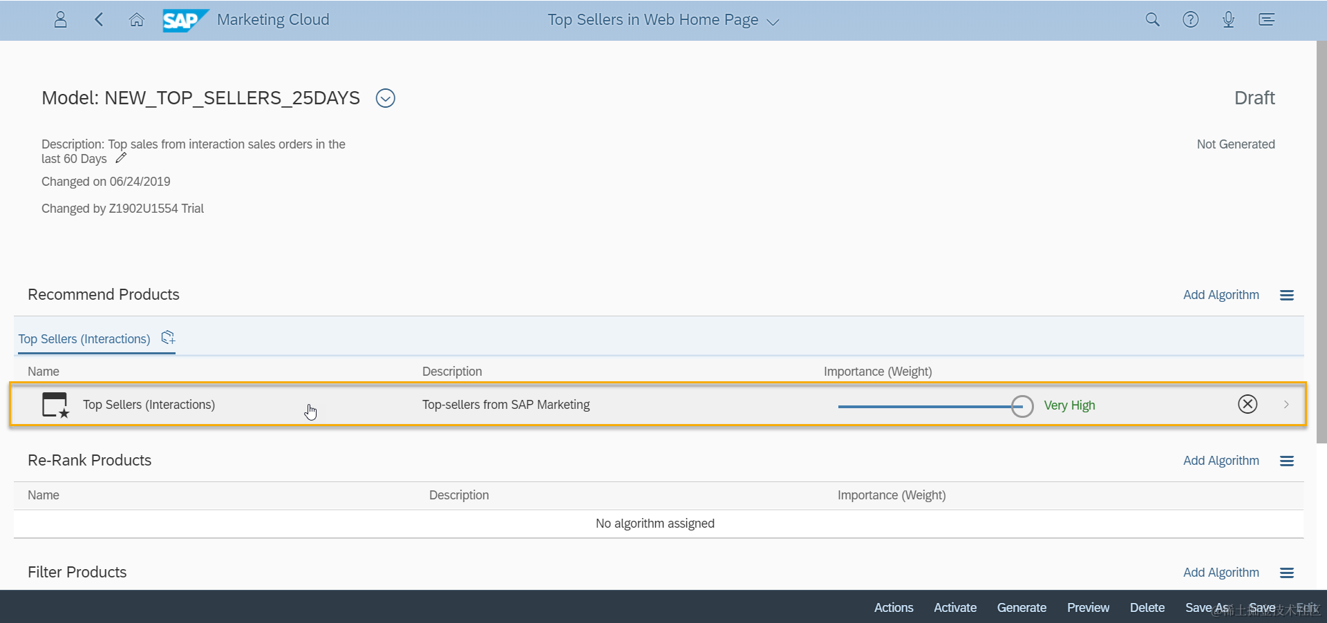 每个推荐场景只能有一个模型类型。 在推荐场景中维护分配至场景的模型类型。除了向客户端应用程序提供推荐外,推荐场景还可以将交互数据发布到 SAP HANA数据库。