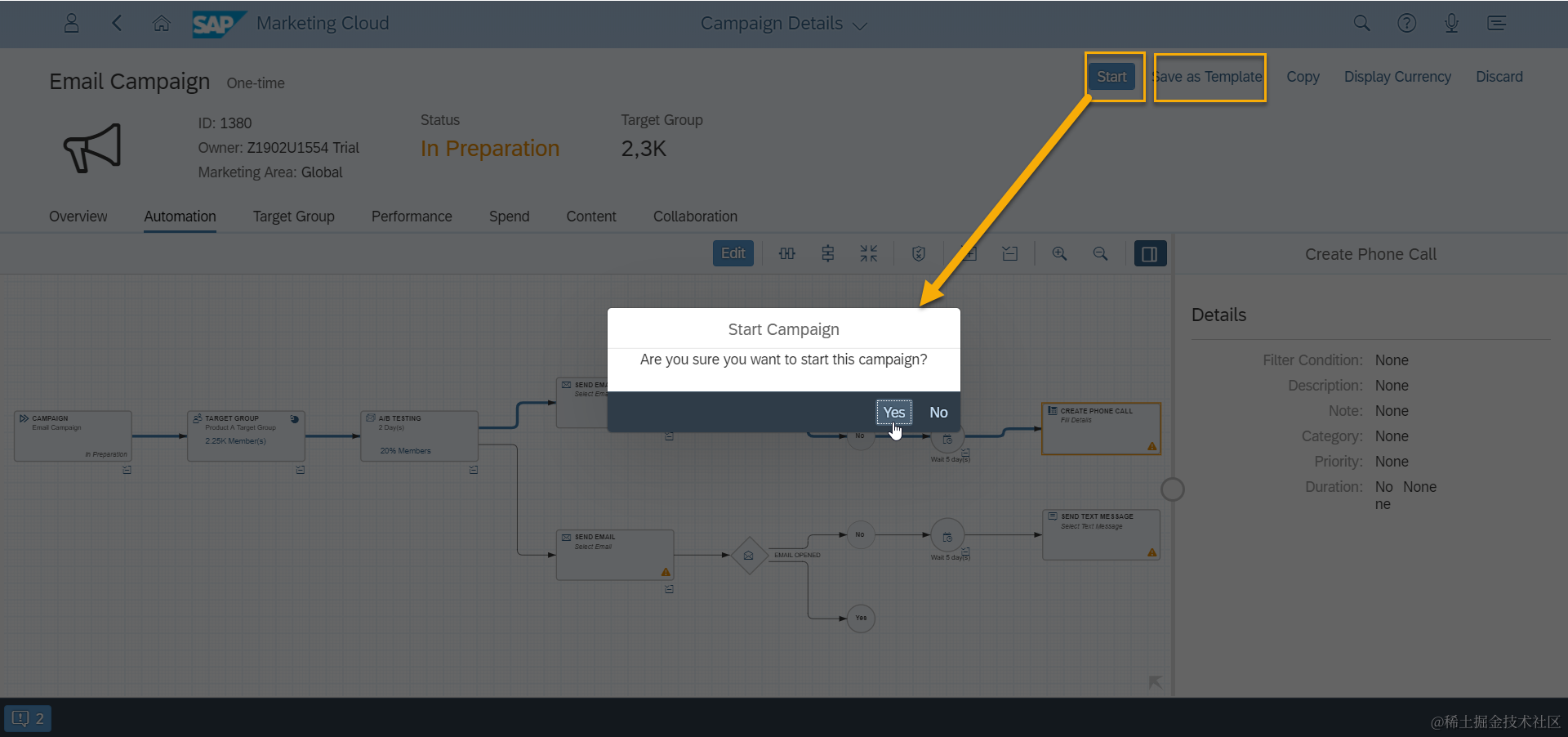 设置结束后,我们选择Done,并且点击Start即可开始执行营销活动。点击Save as Template创建为营销活动模板。若设置的开始时间还未到达,活动会在时间到达时自动进行。