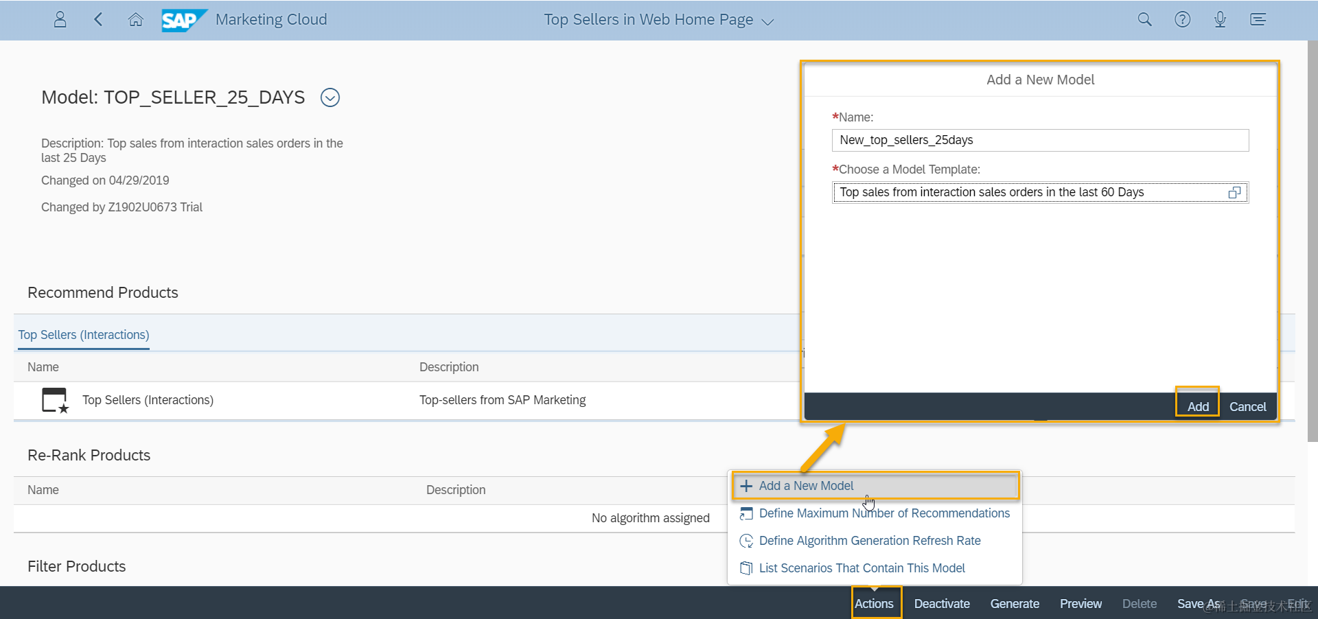我们可以为该场景添加一个新Model。输入模型名称并选择模型模板,此处选择“过去60天交互销售订单中的销售额排名”模板,此外,还有“过去15天查看次数最多的项目”、“Web 产品详细信息页面中一同查看的项目”等多种模型模板可选。