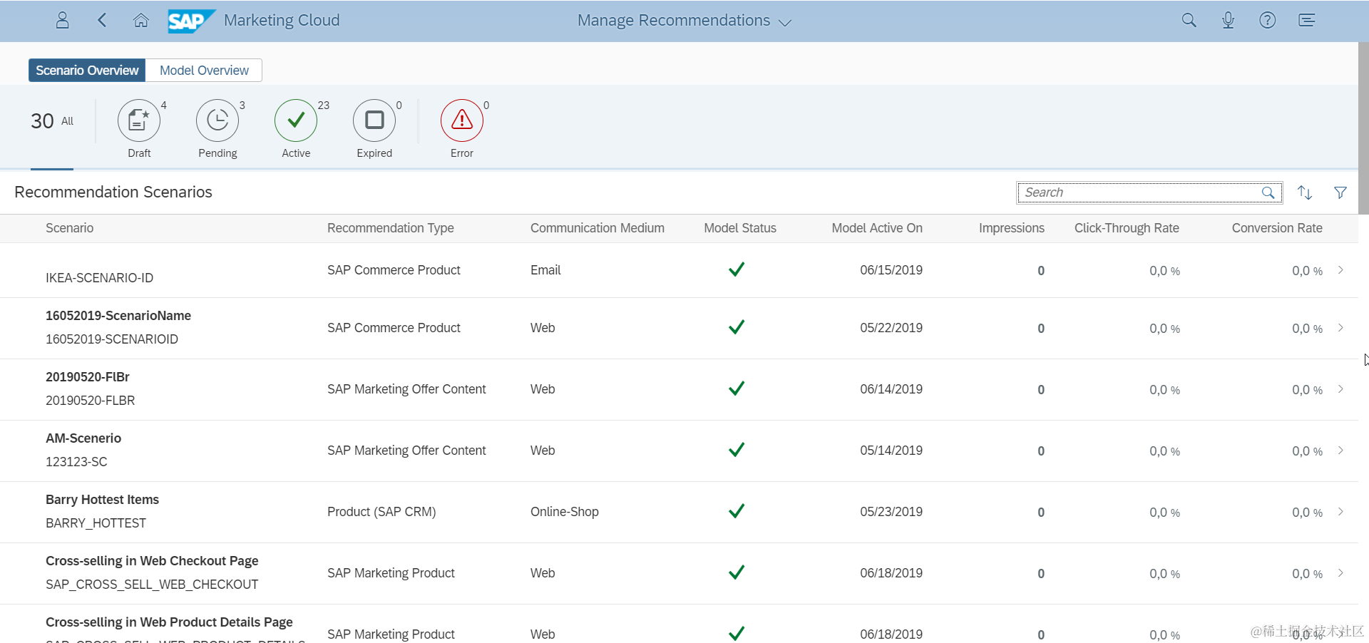 在Manage Recommendation的Scenario Overview界面,我们可以搜索、查看和维护推荐场景。