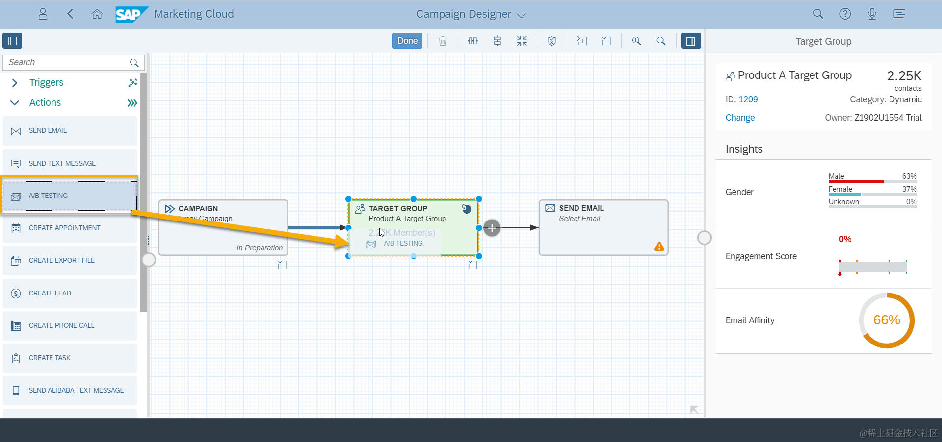 为营销活动添加内容,如加入A/B测试,向Target Group发送两种不同内容的邮件,然后收集这些群体的业务数据,以此查看营销效果,帮助我们调整营销策略。