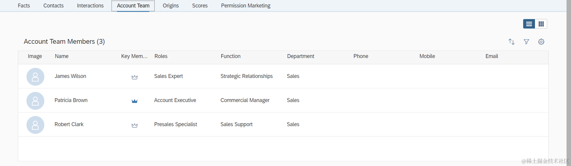 Account Team标签页提供了负责当前公司客户的所有客户团队成员的概览。可以在Key Member指定某位联系人作为负责当前公司客户的主要员工。