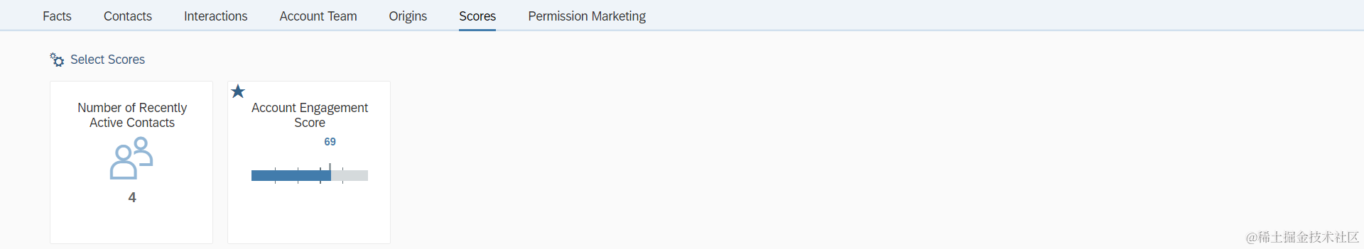 Scores标签页解释公司客户的各种启发式和预测评分,能够帮助您识别一个客户是否有潜力成为参考客户,或者是否是待处理的合适候选人。点击星标更改在抬头的显示。