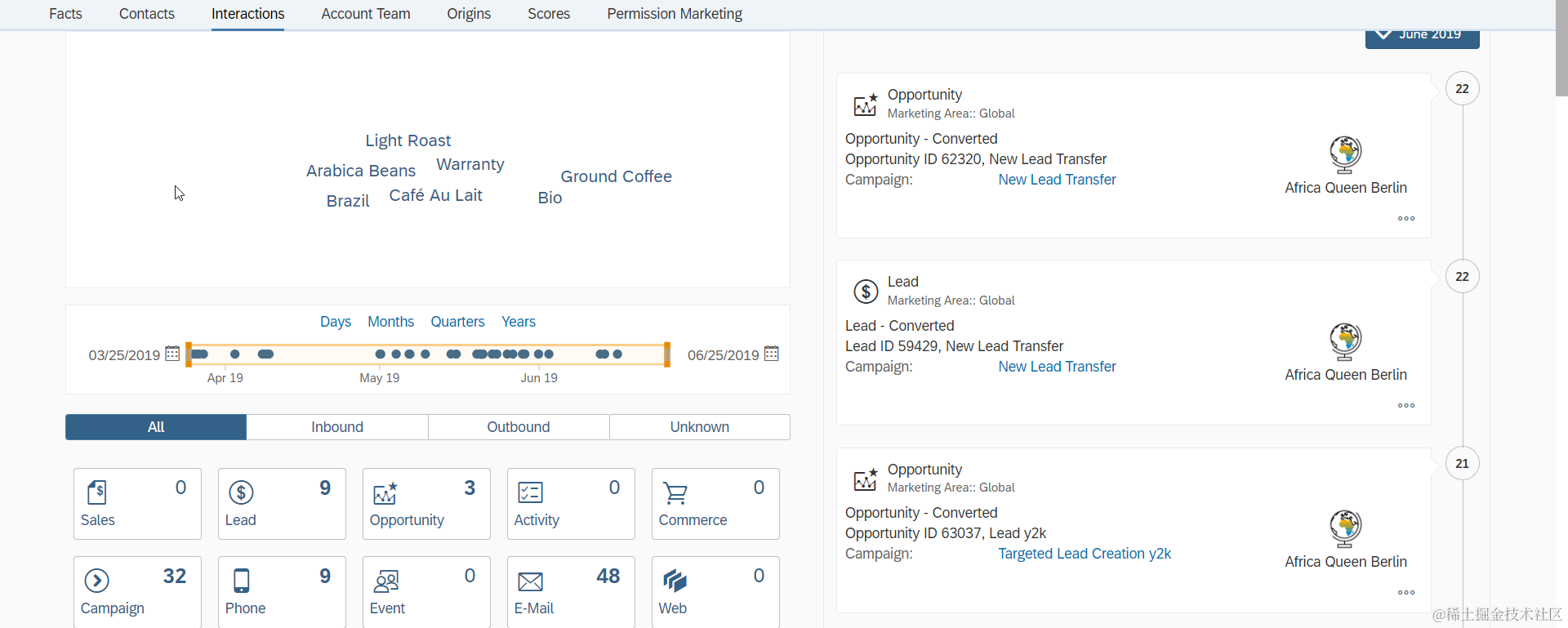 Interactions标签页提供了交互和关注对象,以及当前公司客户与我们进行交互时所使用渠道的概览,点击每次交互查看交互详情。