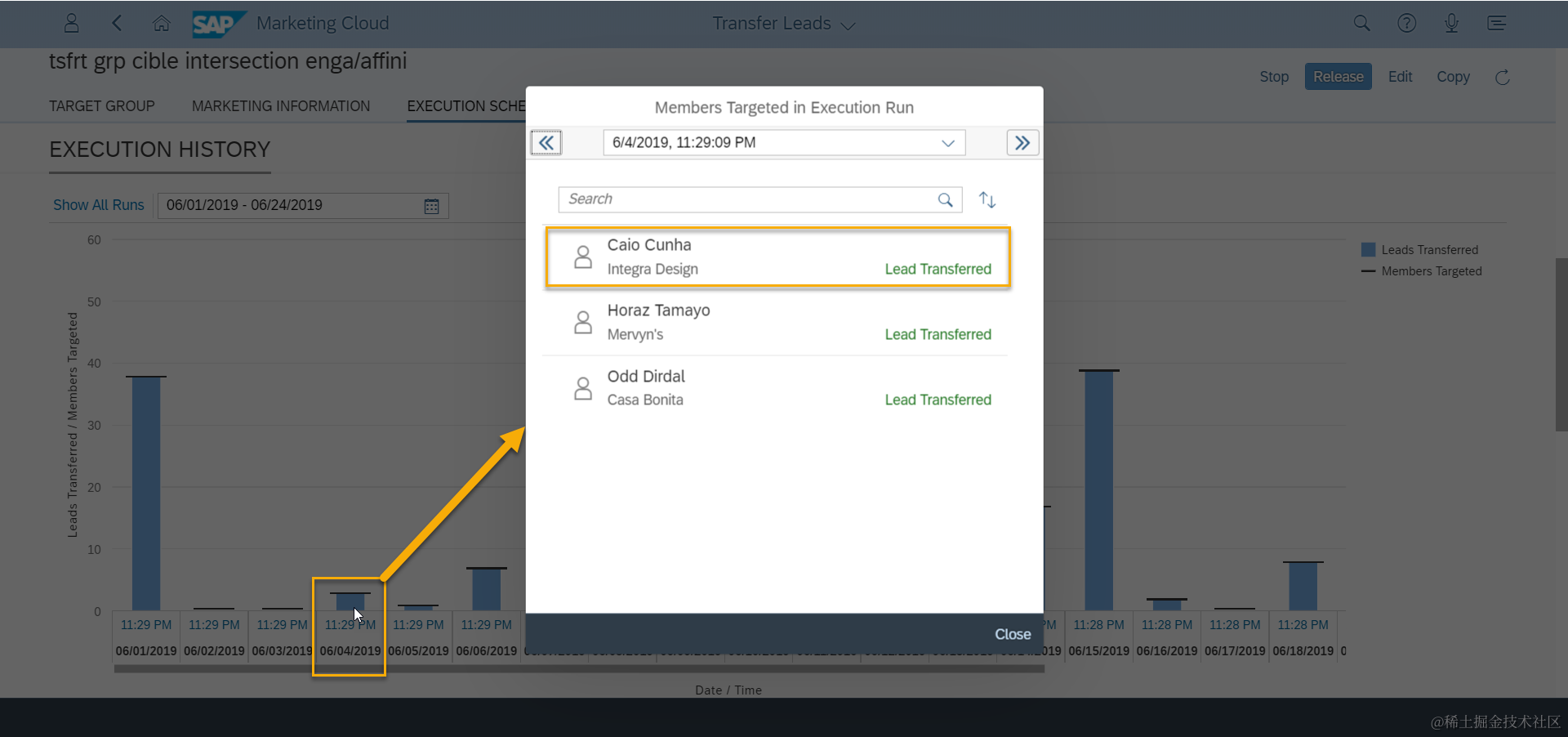 Transfer Leads在执行过一段时间后可以查看执行情况和日志。柱状图显示的内容是每次执行传输的人数。