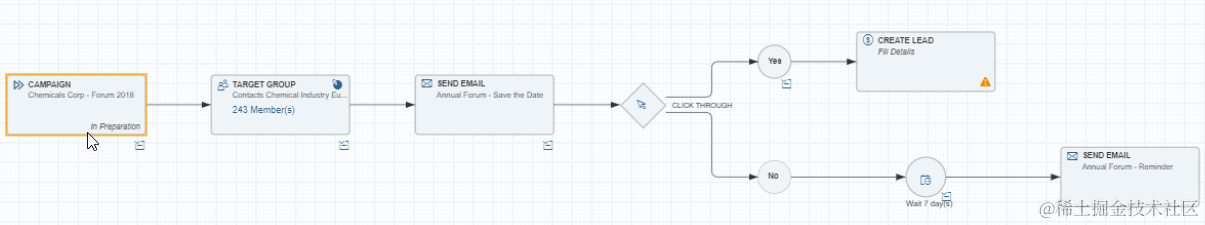 在将目标组分配到相应的阶段后,市场营销人员就可以定义在每个阶段与这些联系人共享的信息。市场营销人员通过创建与每个阶段相关的一系列简单营销活动来共享信息。每个营销活动的内容都是特定的,与各个阶段相关,并且因阶段而异。