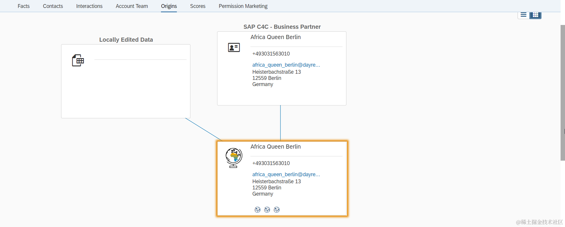 Origins标签页提供了当前公司客户的数据来源列表,并显示从哪个源系统或来源派生了哪些数据。在中心高亮突出显示的磁贴表示客户的最佳记录,这是存储在单个记录中的最有价值的联系人主数据。