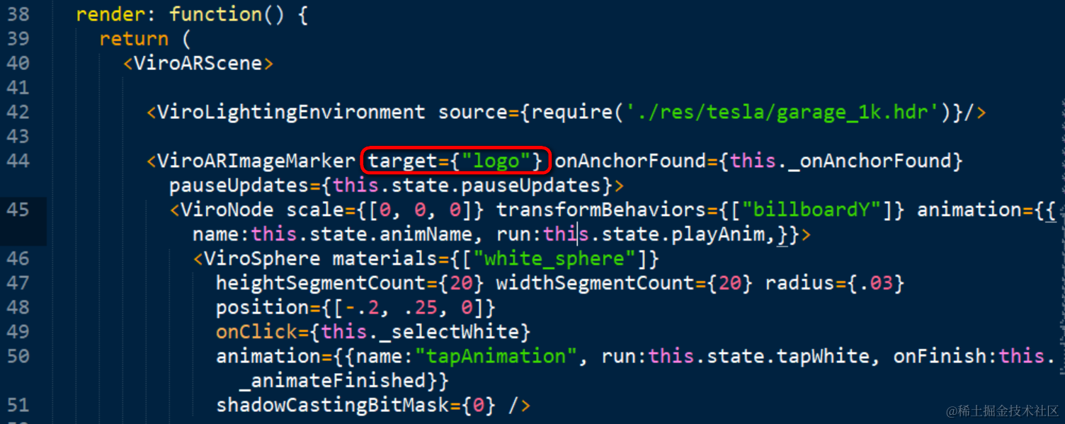 回到Leo的demo,从上图能看出target指向的Marker内容为一个名为logo的对象,这个对象通过API ViroARTrackingTargets.createTargets创建,输入参数是该图片在AR项目里的相对路径: