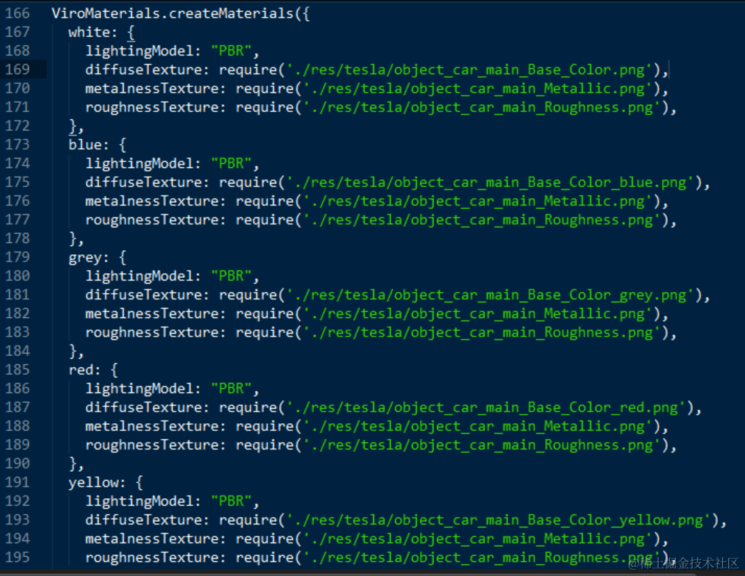 我们通过ViroMaterials.createMaterials,传入不同的texture参数,生成不同的Material对象,最后赋给上图Viro3DObject的materials属性,即完成了待替换3D对象的声明。