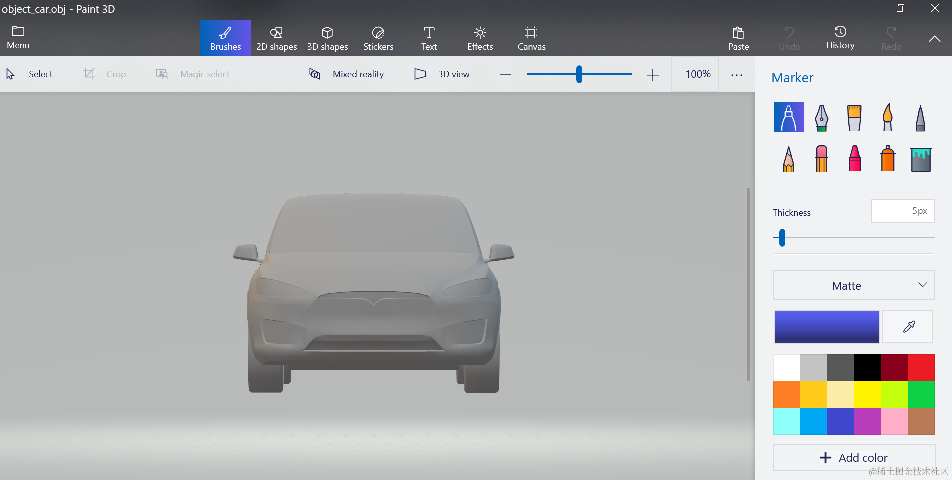 我们很容易观察到,在Paint 3D里看到的这辆特斯拉汽车,表面毫无光泽,而Leo视频中的特斯拉,外表可以更换不同的颜色,这是通过给3D模型添加不同的texture(纹理)来实现的。