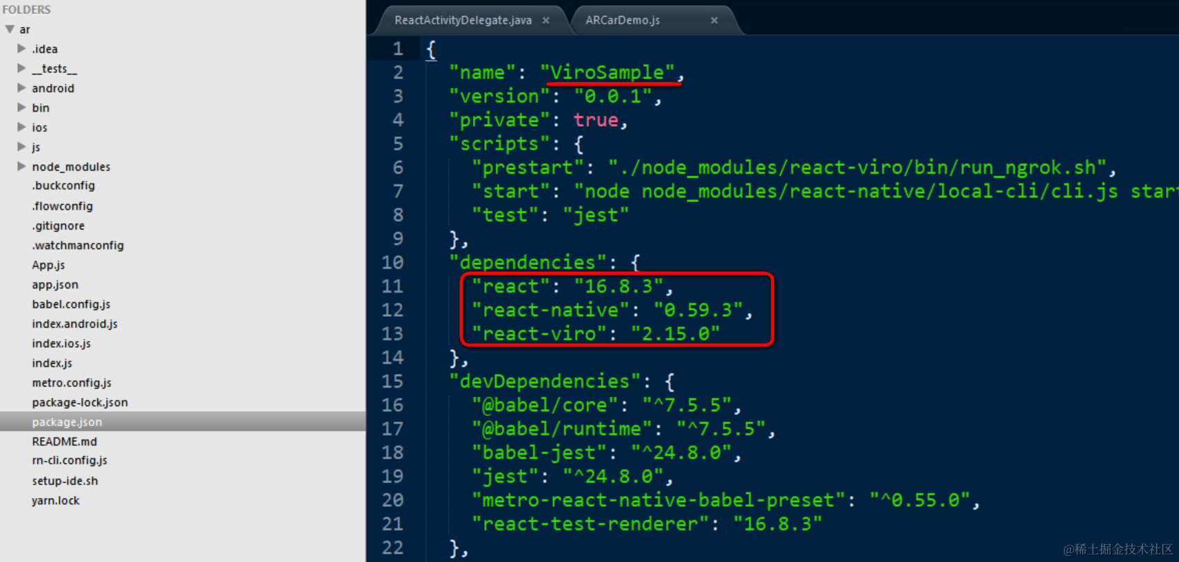 打开Leo的项目工程,找到package.json,项目名称为ViroSample, 里面声明了对React-Native和React-viro的依赖。
