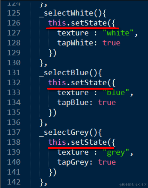 因为Viro3DObject的materials属性绑定的React模型字段为this.state.texture, 因此用户选择了新的颜色后,调用React的this.setState方法将texture属性设置成选中的颜色,即可实现车身颜色的动态刷新。