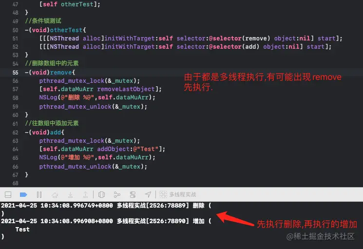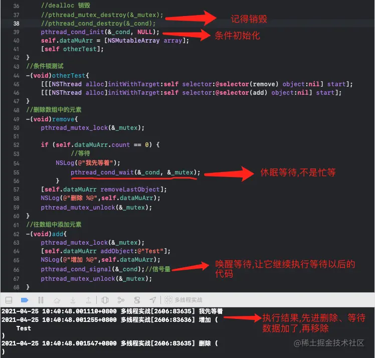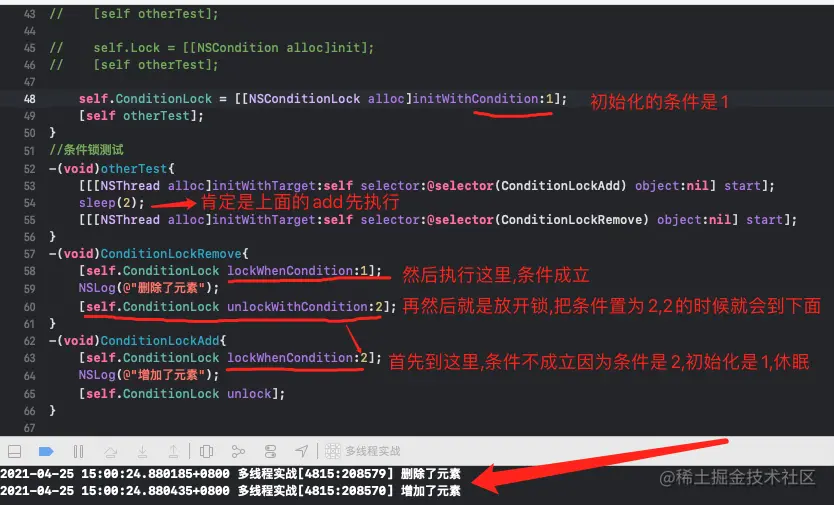 从log输出,可以看出,条件锁确实可以解决这种需求.而且我们可以发现pthread_cond_wait在休眠的时候是解锁了,所以add方法才能继续执行,被唤醒的时候又加锁,所以加锁和解锁是还是成对出现的.还有个补充点就是:目前是一个线程在等待,如果是多个线程在等待,我们就用pthread_cond_broadcast(&_cond)即可,broadcast是广播的意思,所以很容易理解,大家可以试试.