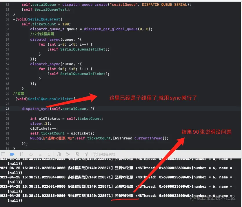 直接使用GCD的串行队列,也是可以实现线程同步的.我们不能想到线程同步,就想到锁,我们要知道线程同步的本质是什么,就是多条线程抢占同一个资源,所以串行队列也是可以解决线程同步的问题.比如我们就拿卖票来说.