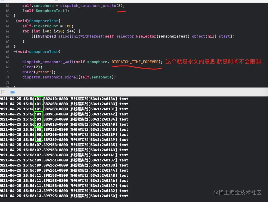 dispatch_semaphore_wait(self.semaphore, DISPATCH_TIME_FOREVER):如果信号量的值是>0,就让信号量的值减1,然后继续往下执行代码...直到当信号量的值是0的时候,这时候就会休眠等待.首先看你传的时间,如果是now就立即执行,这里传的DISPATCH_TIME_FOREVER就不受时间这个条件限制了,直到当信号量的值>0才会唤起休眠,继续执行.