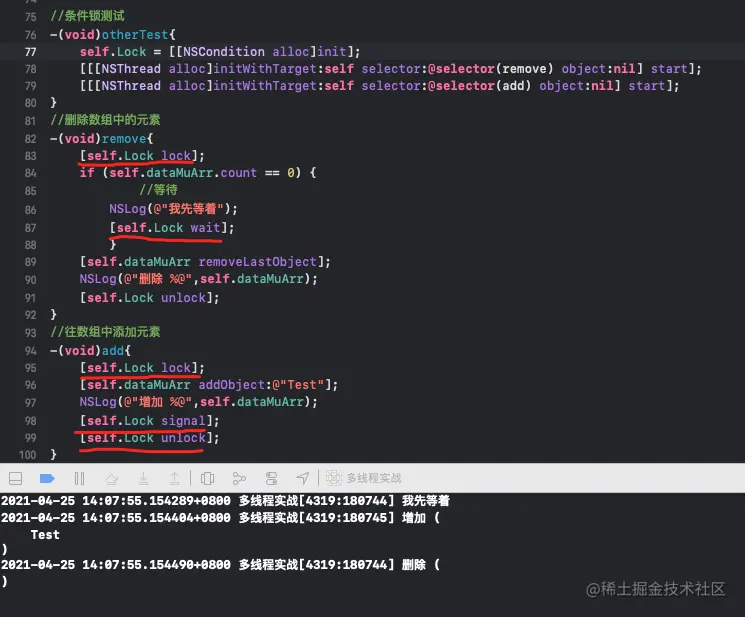 我的业务需求是希望:如果dataMuArr.count==0的时候,我不删除,等dataMuArr有数据了我再去删除.那这时候,我们就可以用条件锁,请看下面: