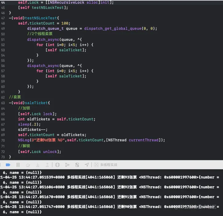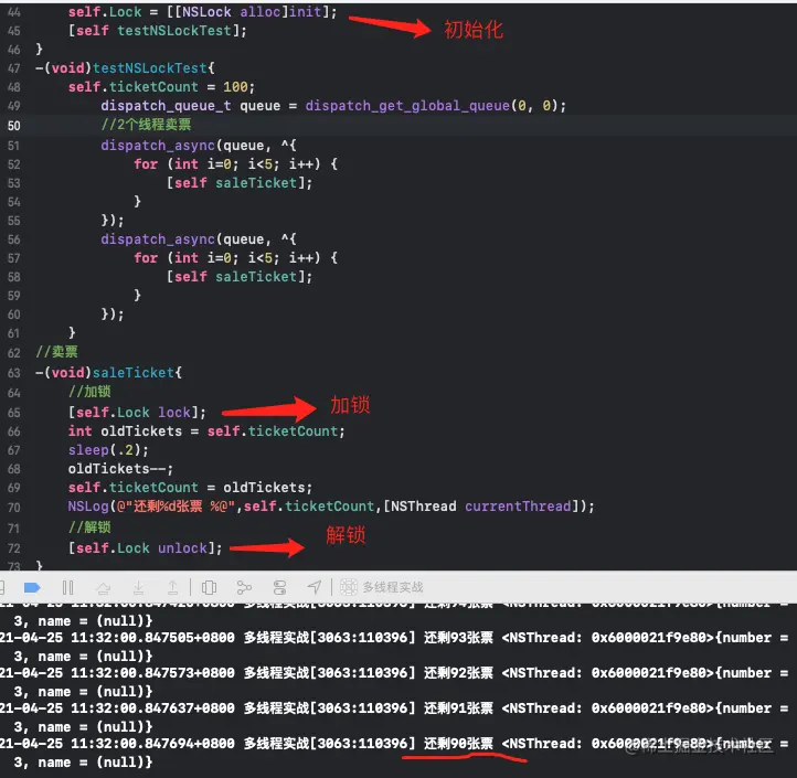 NSLock:它是对pthread_mutex普通锁的封装,一看就是oc对象,使用起来更加面向对象,我们看下用法