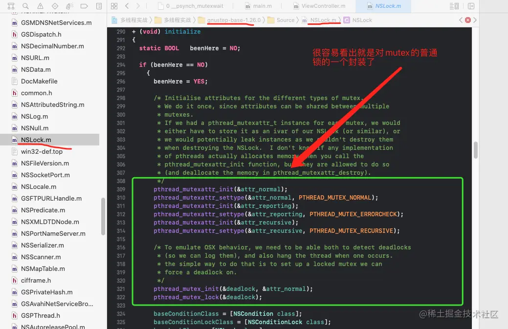 如果我们通过打断点也是能找到NSLock的实现,具体调用等等,但是发现很麻烦,这时候我们就用上面说的GNUstep里面查找一下,如下图: