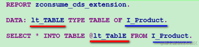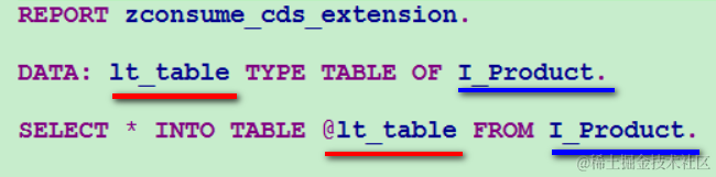 假设有这样一段简单的ABAP代码,通过OPEN SQL从名为I_Product的CDS view里读取数据到内表lt_table里。