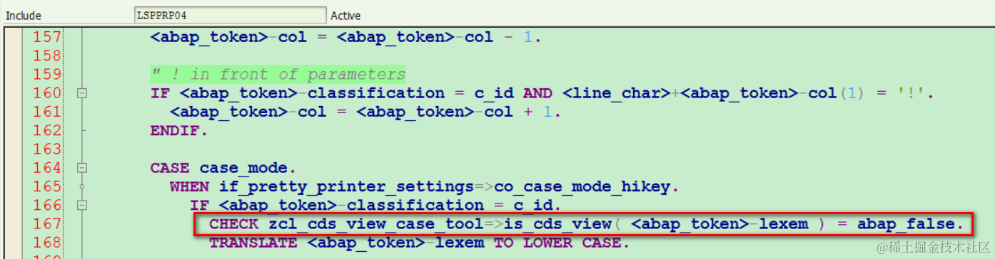 然而Pretty Printer的这种行为会带来一个小问题,如果代码里访问了某个CDS view,比如例子中的I_Product,因为它不是一个ABAP关键字,所以也会被转换成全部是小写字母的组合:i_product.