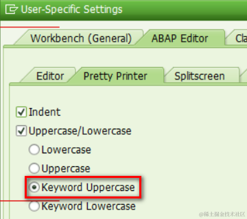 通常情况下我们期望ABAP里的变量名都统一用小写,为此只需在SAP GUI的ABAP Editor设置里,打开Pretty Printer配置页面,将Keyword Uppercase的勾打上。