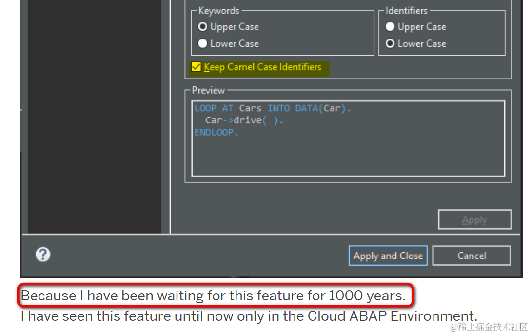 这意味着偏爱驼峰命名法的ABAP开发人员,如今也可以在IDE的支持下进行ABAP代码编写了。