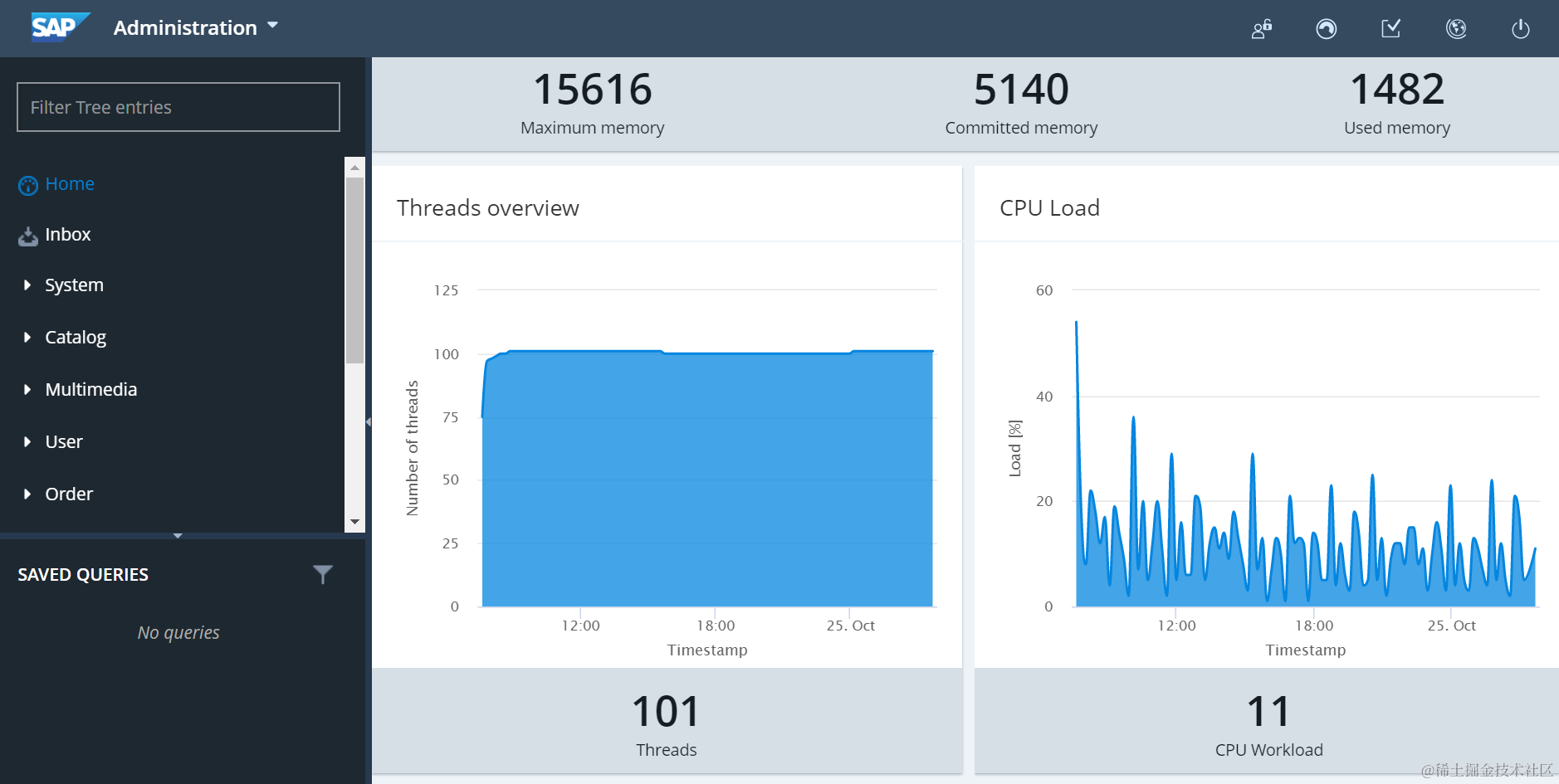 Hybris Commerce Cloud backoffice的一些使用截图 - OAuth工作中心 已注销 2021-04-25 74 阅读1分钟 home工作中心 任务队列一览 数据库连接概览: 内存使用情况: 线程情况,CPU利用率: 要获取更多Jerry的原创文章,请关注公众号"汪子熙":