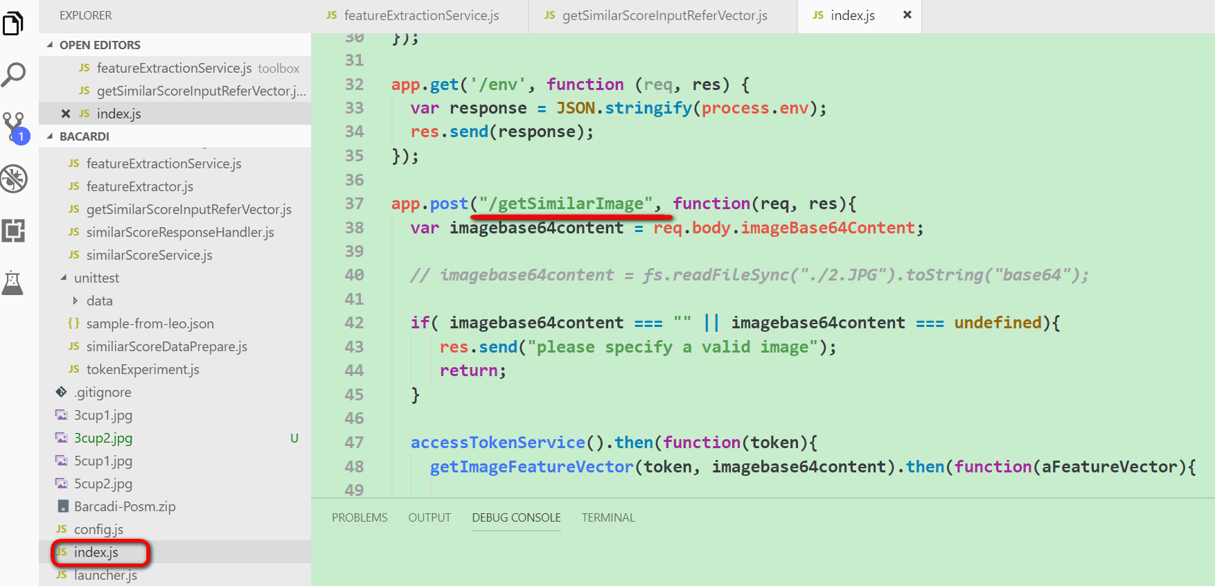 The recognization of top 3 similar images is achieved by calling another Leonardo Machine Learning service: Image Similarity Scoring. In order to ease consumption of this service, the project exposes an endpoint /getSimilarImage defined in file “index.js”.