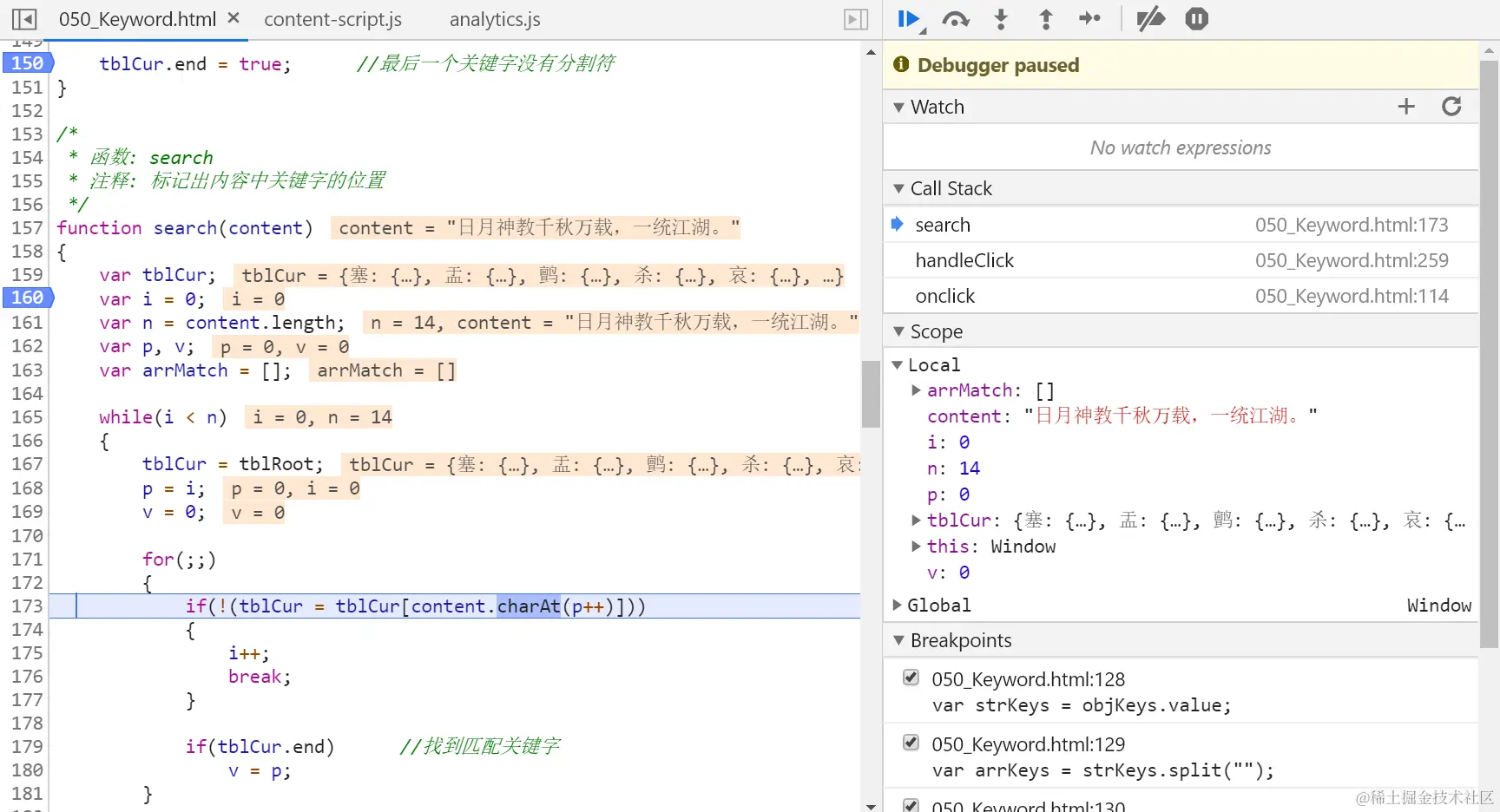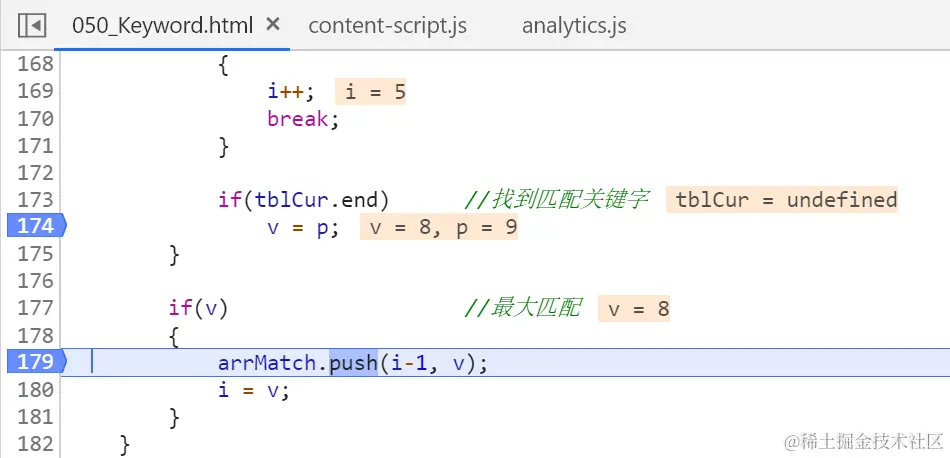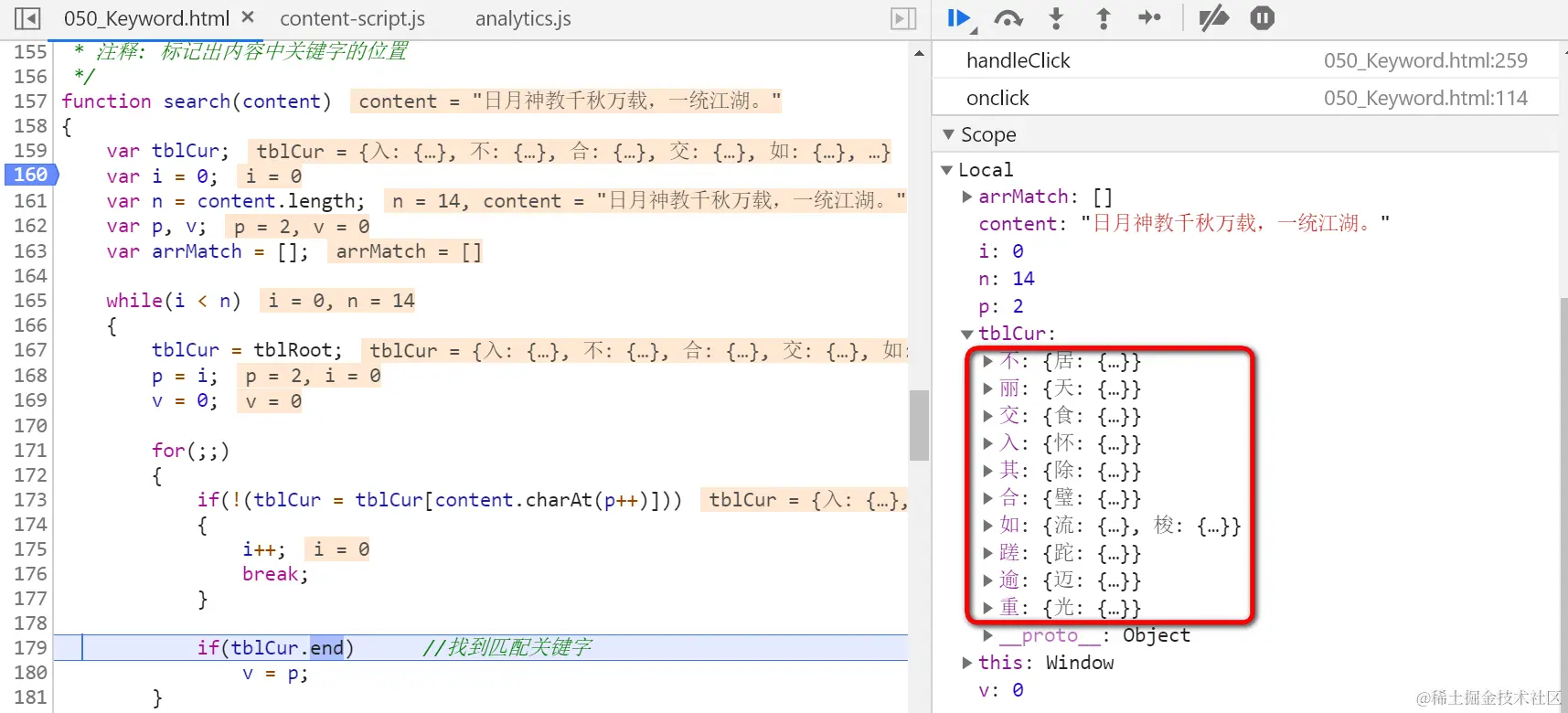 进入165行的外层while循环,再进入173行的内层for循环,检测是否有测试字符串第一个字符“日”开头的成语。因为成语是由4个字符组成,所以需要用内层for循环逐一试探,如果遇到tblCur.end为true的元素,说明在测试字符串中发现了一个成语。