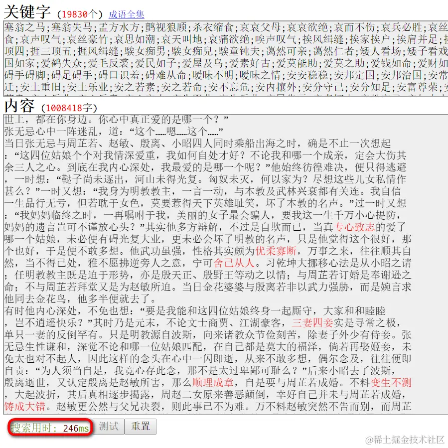可以看到仅仅用了246毫秒,就将这部一百多万字的《倚天屠龙记》里出现的所有成语,以红色高亮的方式高亮出来。