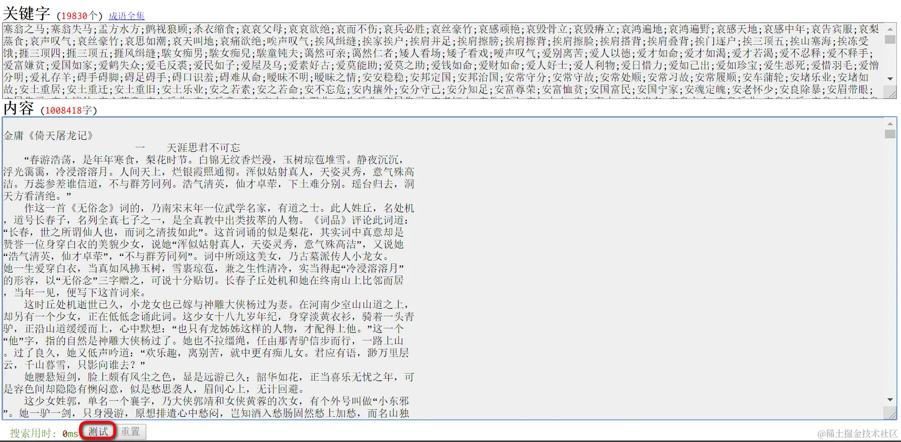 然后复制一本金庸小说的内容,粘贴到网页的“内容”区域,点击按钮“测试”: