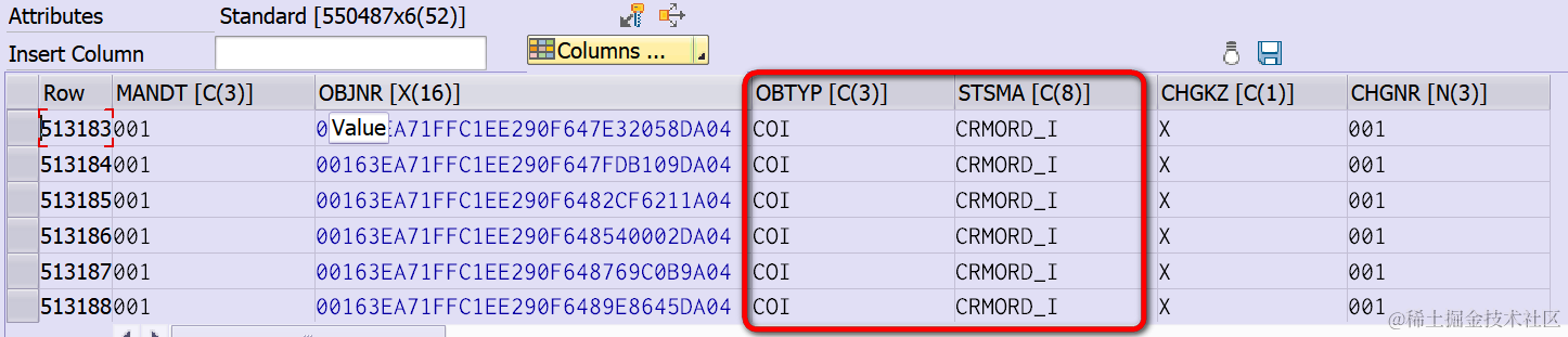 回到Jerry接受的实际工作任务。德国同事让Jerry在某个CRM测试系统上做个统计,列出在数据库表CRM_JSTO里,OBTYP(Object Type)和STSMA(Status Schema)这两列拥有相同值的内表行的个数。大家可以把"OBTYP和STSMA两列具有相同值的内表行"类比成上图中重复出现的单词。