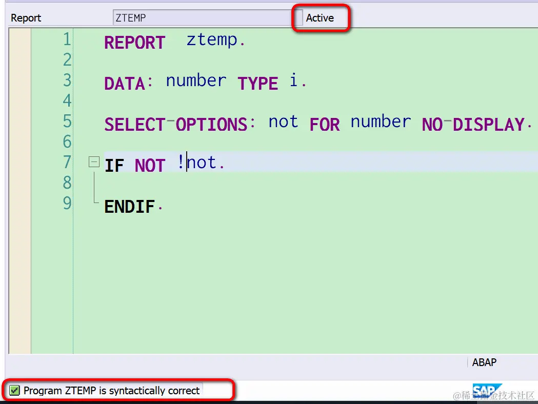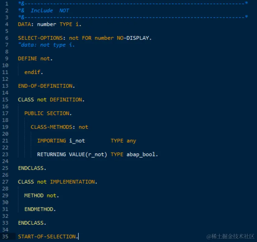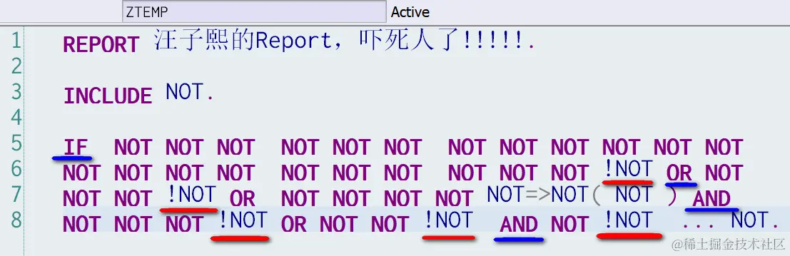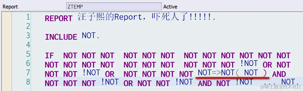 (1) 从评论区能看出,很多朋友都找到了谜题的突破口,即 NOT=>NOT( NOT ). 这是典型的ABAP类静态方法调用的语法,因此说明,在名为NOT的INCLUDE里,包含了一个名为NOT的ABAP类,有一个名为NOT的静态方法。同时,这个静态方法调用的前面出现了OR这个布尔逻辑运算符,只能有一种情况才能通过语法检查,就是NOT静态方法的输出参数为RETURNING类型,然后该输出参数作为OR的操作数。
