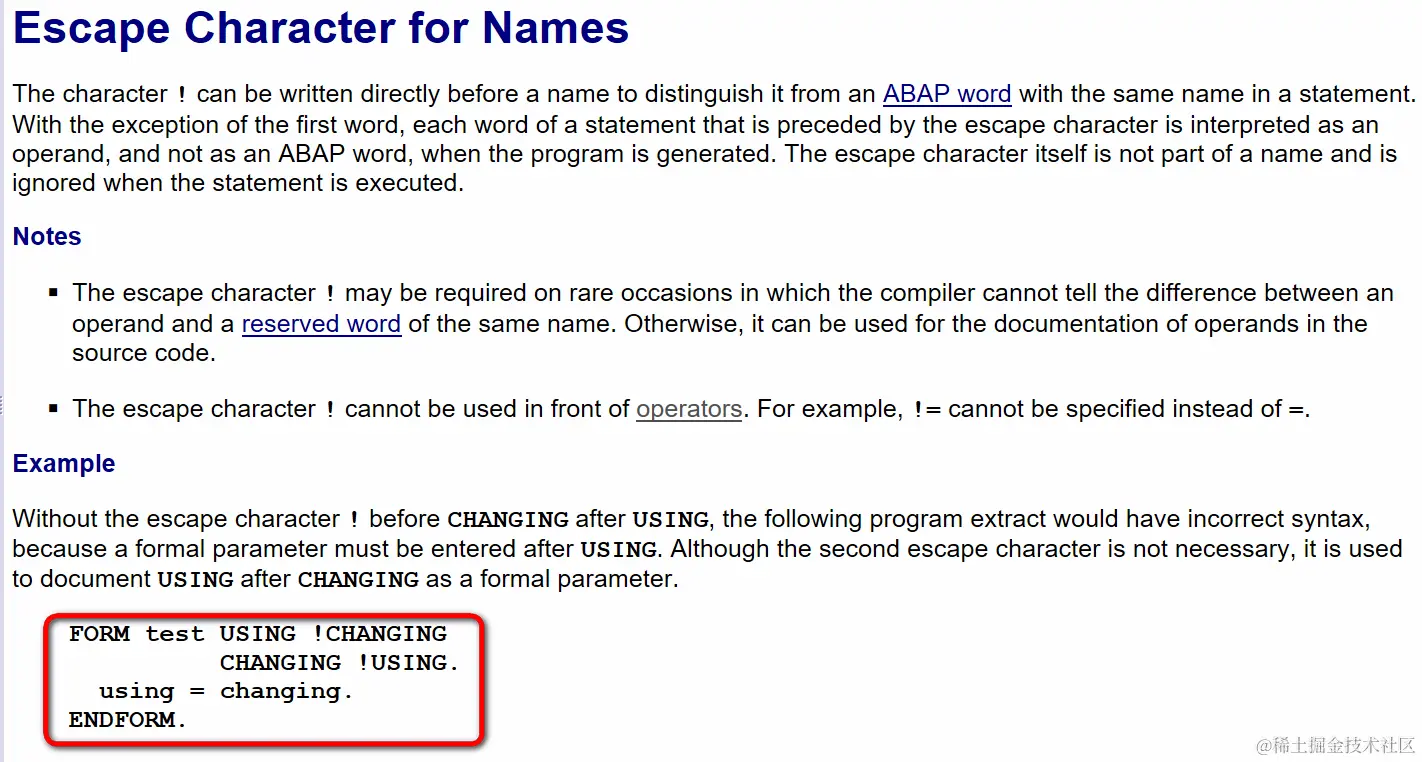 ABAP帮助文档里说的很清楚,!作为ABAP里的转义字符,能够告诉ABAP编译器,!后面紧跟的并不是关键字,而是普通的ABAP标识符。