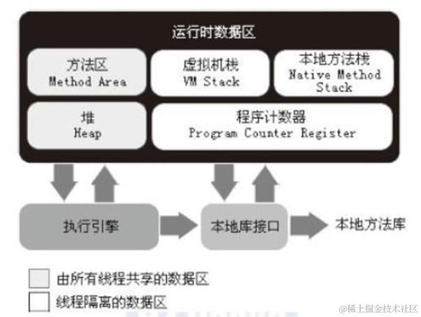 Java虚拟机在执行Java程序的过程中会把它所管理的内存划分为若干个不同的数据区域。这些区域都有各自的用途,以及创建和销毁的时间,有的区域随着虚拟机进程的启动而存在,有些区域则是依赖用户线程的启动和结束而建立和销毁。根据《Java虚拟机规范(第2版)》的规定,Java虚拟机所管理的内存将会包括以下几个运行时数据区域,如下图所示: