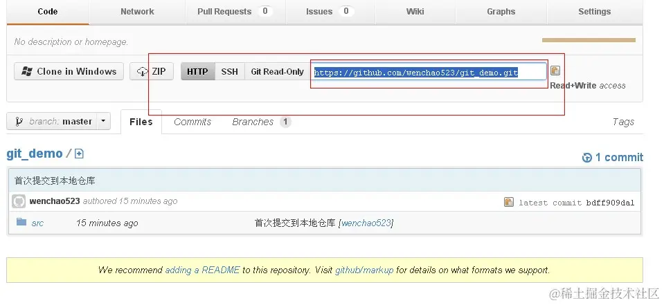 注意创建好远程仓库后,点击进去,此时可以看到一个HTTP地址,如红线框,这个是你http协议的远程仓库地址