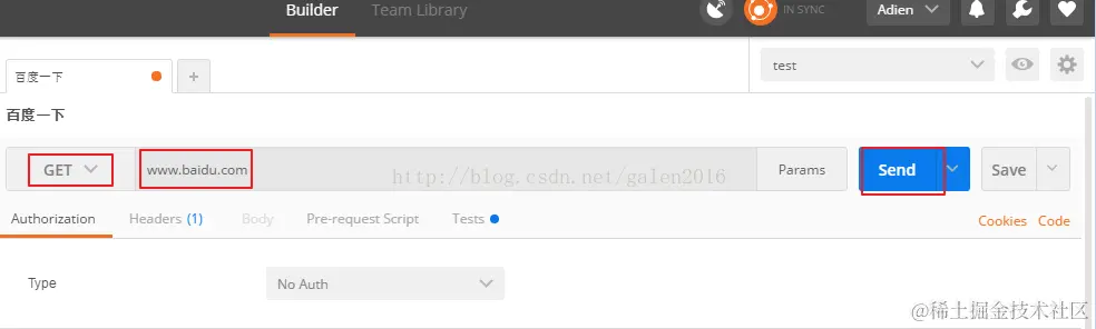 1、点击“+”添加一个请求,选择请求方式,下面选的是“GET”,输入请求地址,点击“Send”