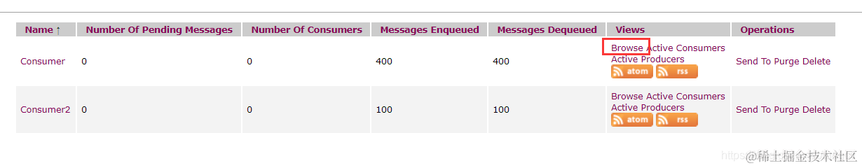 从上面的代码可以看出,我们在receiveQueue方法上面多加了一个注解@SendTo("Consumer2 "),该注解的意思是将return回的值,再发送的"Consumer2 "队列中,下面我们再来跑一下前面的测试,在监控页面中,我们发现,"Consumer2 "队列中已经有内容了,如下: