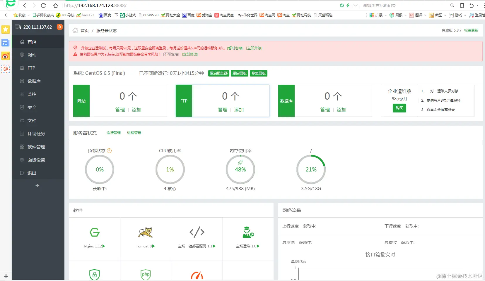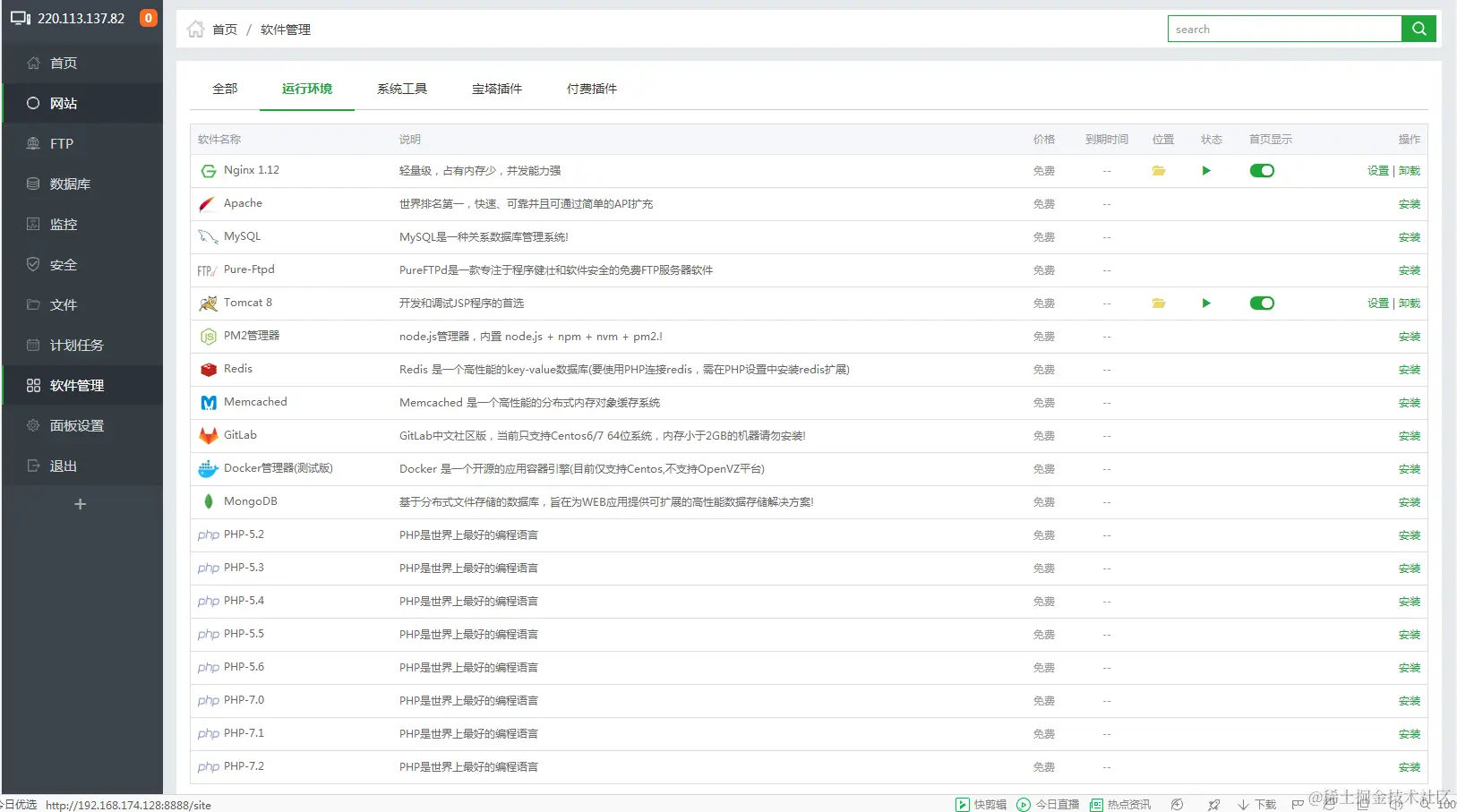 这就是宝塔面板的界面,非常简洁干净,在软件管理中日常的运维所需要的软件都有。