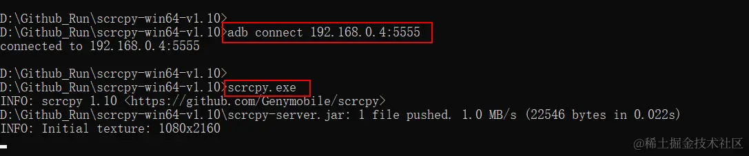 D:\Github_Run\scrcpy-win64-v1.10>adb connect 192.168.0.4:5555