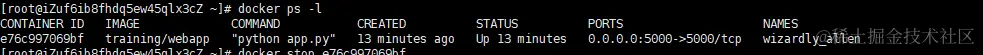 停止容器的命令 docker stop <容器 ID> 如下: