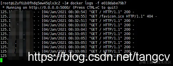 $ docker logs [OPTIONS] CONTAINER Options: --details 显示更多的信息 -f, --follow 跟踪实时日志 --since string 显示自某个timestamp之后的日志,或相对时间,如42m(即42分钟) --tail string 从日志末尾显示多少行日志, 默认是all -t, --timestamps 显示时间戳 --until string 显示自某个timestamp之前的日志,或相对时间,如42m(即42分钟)