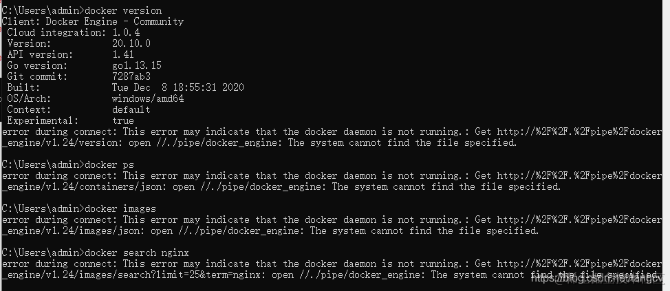 error during connect: This error may indicate that the docker daemon is not running.: Get http://%2F%2F.%2Fpipe%2Fdocker_engine/v1.24/images/search?limit=25&term=nginx: open //./pipe/docker_engine: The system cannot find the file specified.