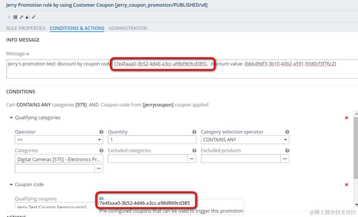 我们点击Promotion rule里任何一个变量的小问号,都能得到一个guid,把这个guid插入大括号,在运行时就能给客户显示变量实际的值,作为提示信息: