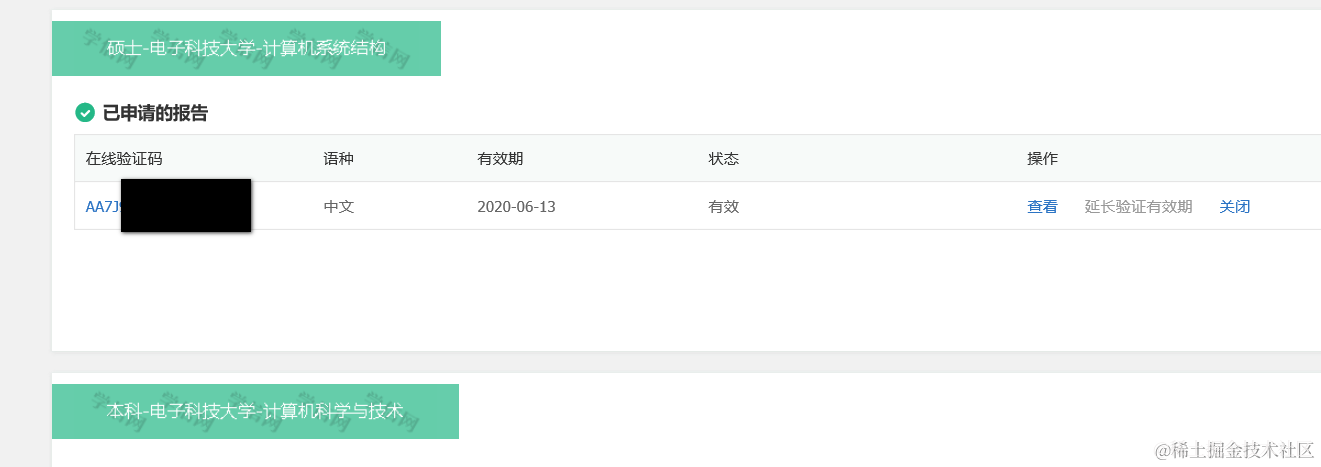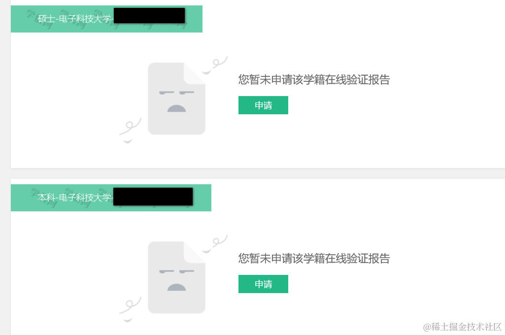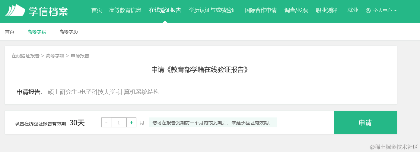 点击本人查询按钮,能自动解析出登录用户的学历情况,点击下图绿色的“申请”按钮: