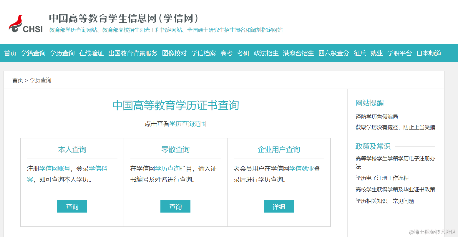 注册后,点击菜单“学历查询”->“高等教育哦学历证书查询”: